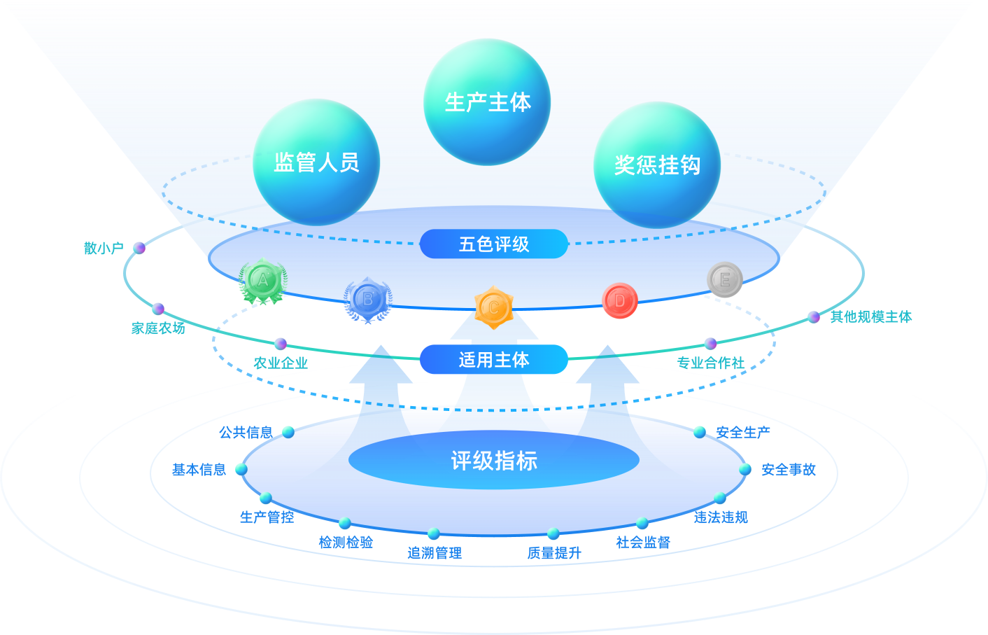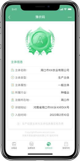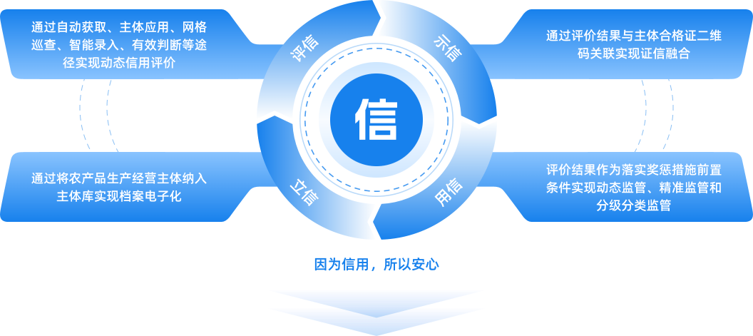 為貫徹落實《國務院辦公廳關于加快推進社會信用體系建設構建以信用為基礎的新型監管機制的指導意見》,深入推動“放管服”改革,發揮信用在創新監管機制、提高監管能力和水平方面的基礎性作用,全國農產品質量安全信用服務平臺構建起“立信、評信、示信、用信”的完整功能鏈條。 推出信用工具應用市場,提升信用信息采集能力和智能化監管水平,將產品溯源和公眾監督集成一體,為農產品質量安全提供監督、評價、信用服務,重在打造農產品的“大眾點評網”。同時,通過社會資源整合協同,為農業企業提供包括供應鏈、電子商務、檢測認證、金融保險等在內的全方位的產業化服務。